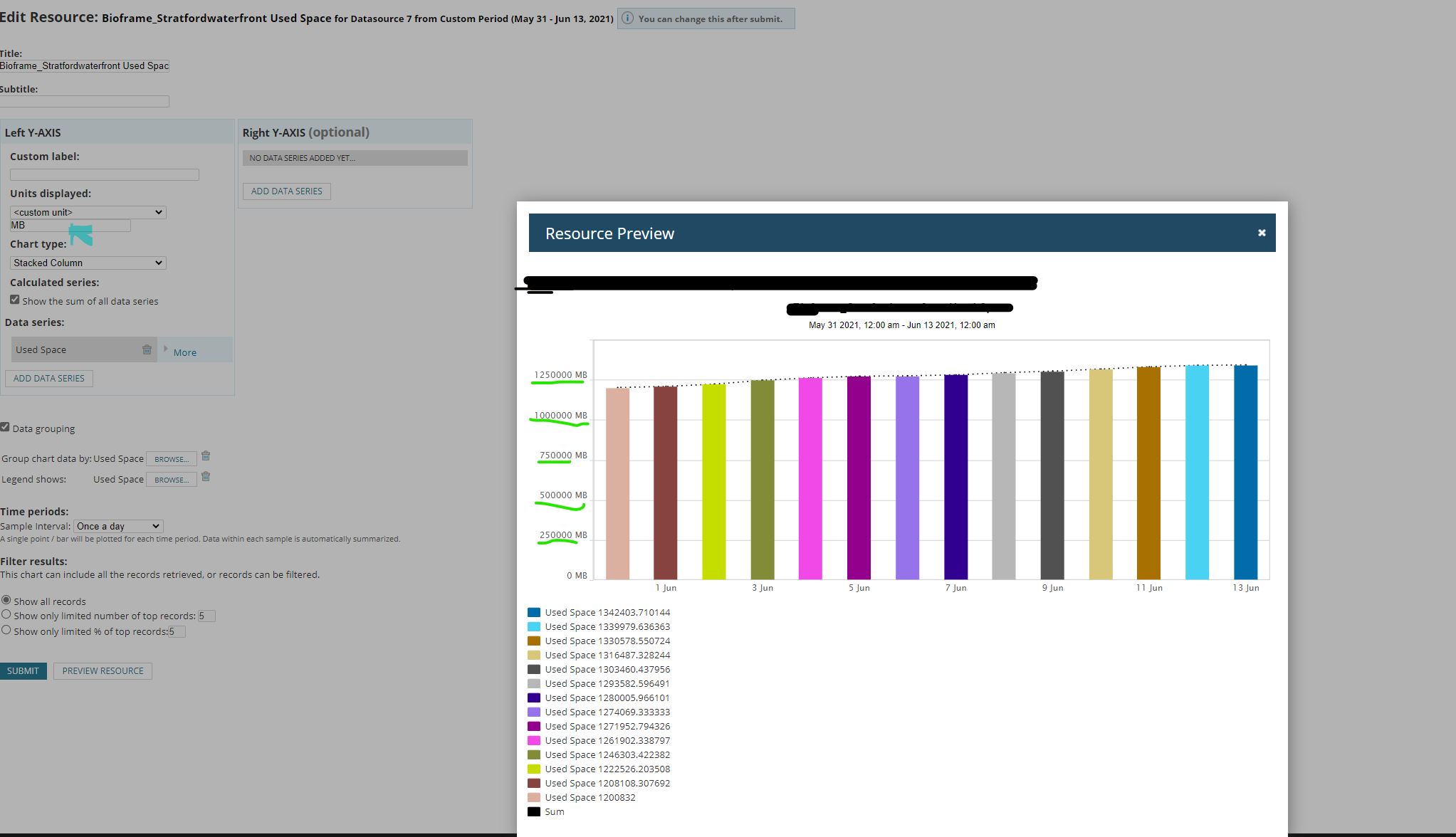 I've recently built a report that displays a chart showing the growth of a SQL database for the last 2 weeks. The problem is the pre defined units (Blue arrow pointing) don't display the correct size of the Database. If I use custom units, type in MB I get the the correct size but I would prefer it to state 1.25 GB as apposed to 1250000 MB.