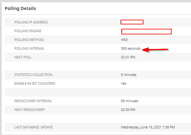On the node details page I can see the "Polling Details" section says the "Polling Interval" is 300 seconds