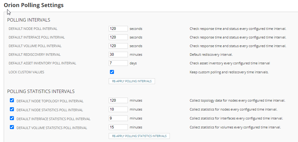 Note: I've tried clicking "re-apply polling intervals" on the above admin page thinking it would change the poll interval for each node, but when I go to the node details page the poll interval remains at 120 seconds. (I've tried to follow the instructions here: https://documentation.solarwinds.com/en/success_center/orionplatform/content/core-polling-intervals-sw1826.htm , but as mentioned, after clicking the re-apply polling intervals button, I see no change to the polling interval on the node details page)