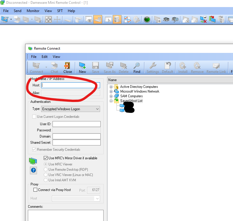 I am trying to connect to a remote computer from the DRS. The DMRC opens and the host field is left blank (see screenshot). How to fix it?