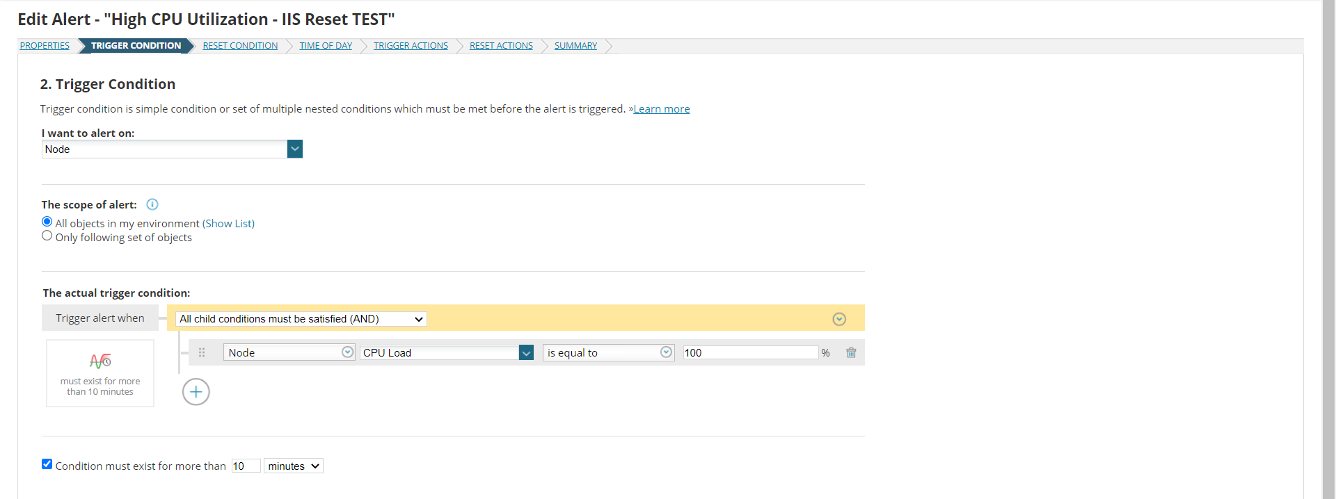 - I have the Trigger set for CPU equal to 100% for 10 minutes