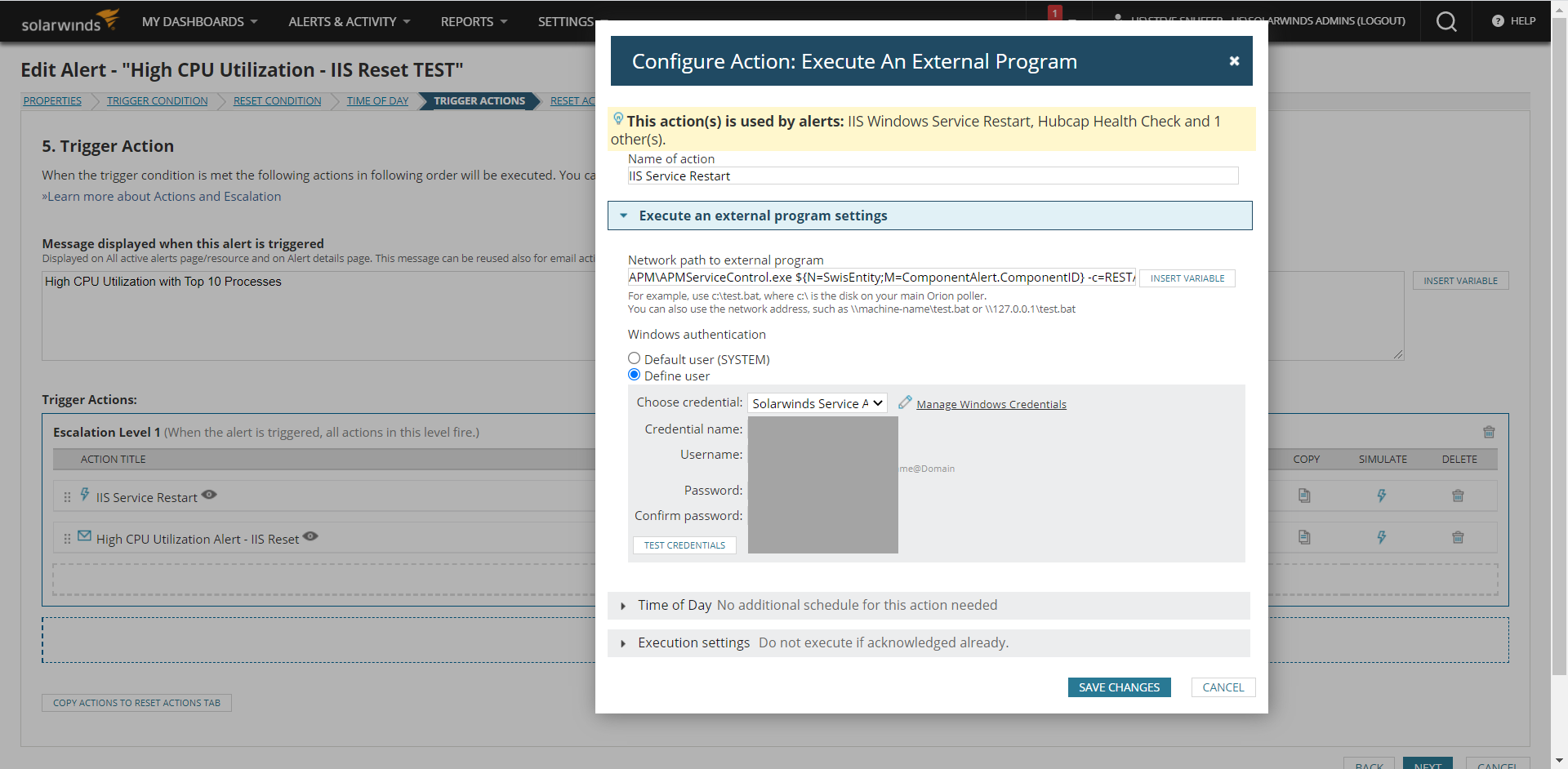 I've been able to Restart the W3SVC Service (essentially Resetting IIS) using the "Execute An External Program" action in another Alert however I want to do the same where if a CPU was at 100% for 10 minutes on a Web Server that IIS would get reset.