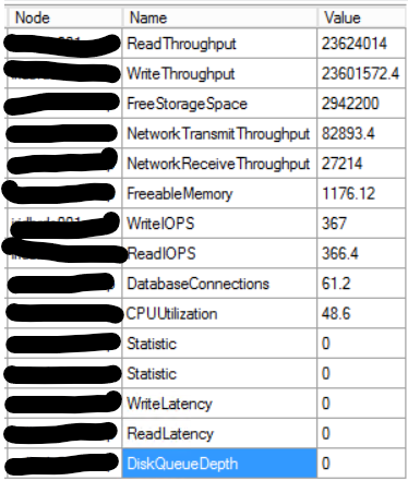 Node, CPU utilization, FreeStorageSpace, FreeableMemory, Read throughtput, WriteThroughput, etc. on one row for each of my RDS nodes.