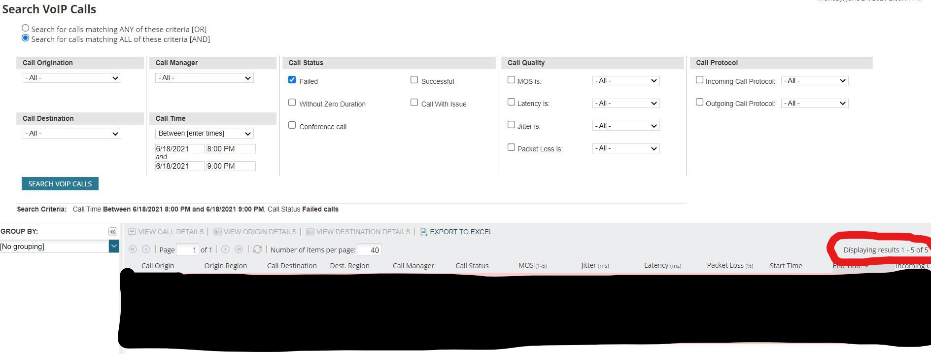 But the VoIP Call search shows only 5 failed calls at that time –