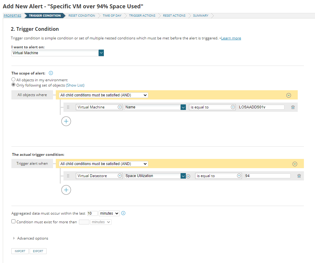 I'm creating a new alert that is specific to a certain VM that has different storage needs. How can I modify this query to specify the VM I want to monitor?