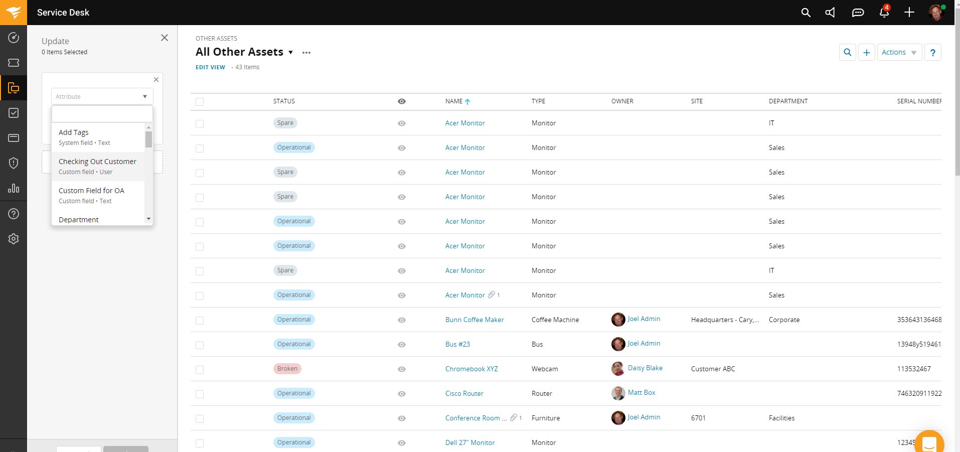 Are you aware of the "Update" feature for Other Assets? When in the "table view" you can select from the Actions Menu > Update. This opens the filter on the left and allows you to choose from a list of fields that can be mass udpated: