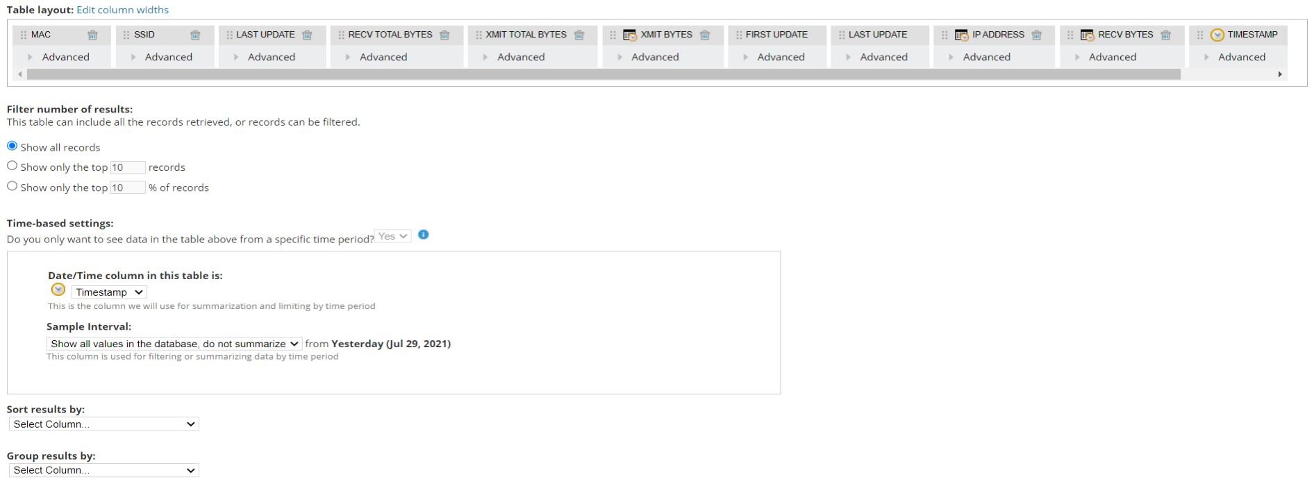 Looking to create a unique wireless clients history (last 7/30 days) report using either a DB query or dynamic query builder for all access points and for a specific SSID.