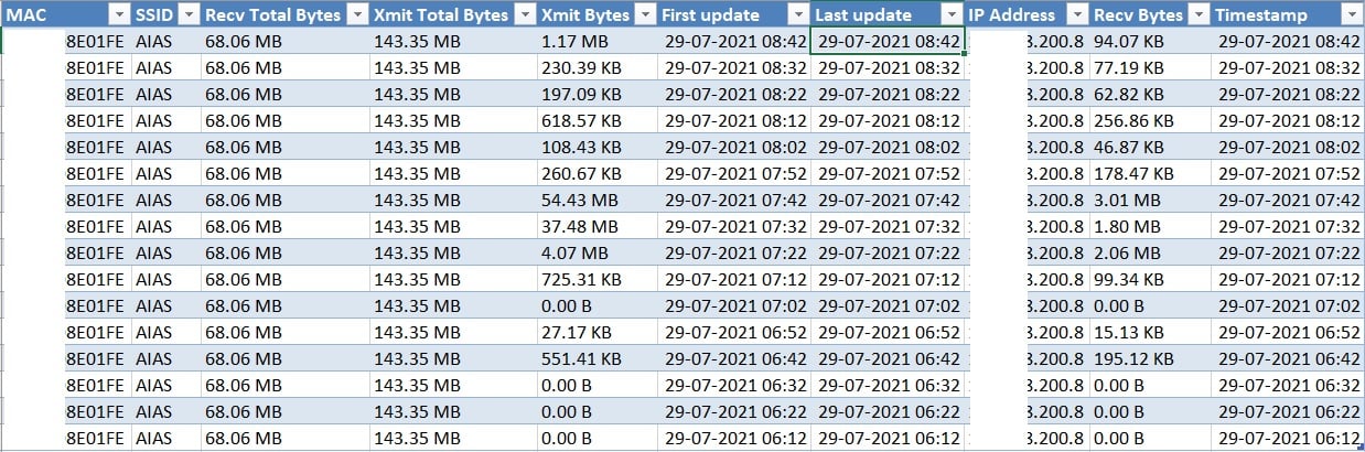 I made an attempt using resource as custom table - dynamic query builder but the outcome has multiple entries for the same MAC address and with identical first and last connected time.