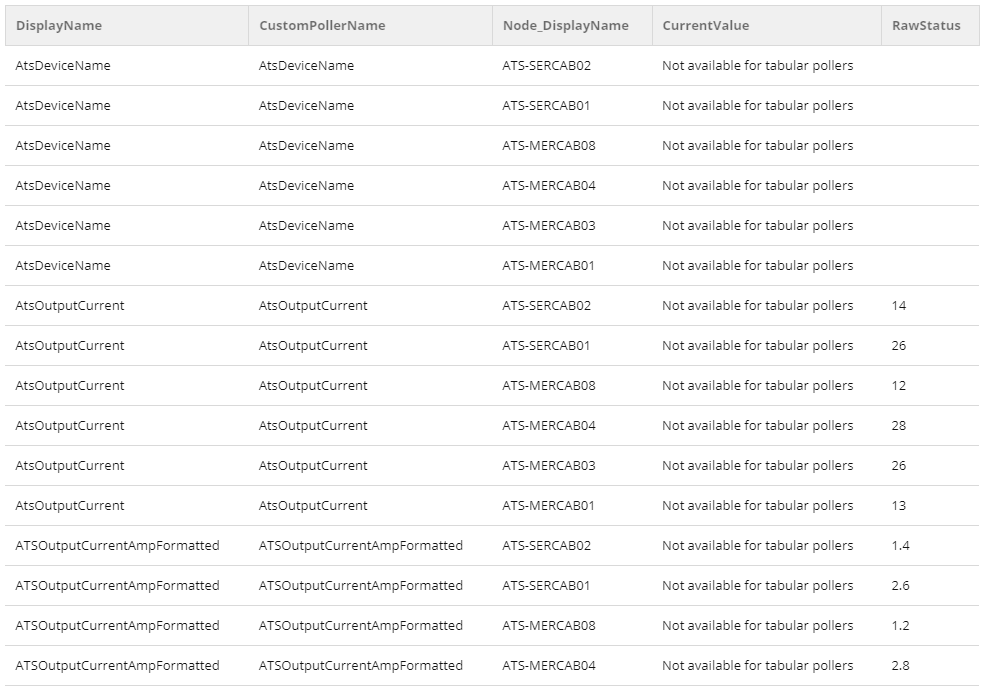 SELECT TOP 100 n.DisplayName, n.CustomPollerName, n.Node.DisplayName AS Node_DisplayName, n.CurrentValue, n.CustomPollerStatus.RawStatus FROM Orion.NPM.CustomPollerAssignmentOnNode n WHERE (n.Node.DisplayName LIKE '%ATS%')