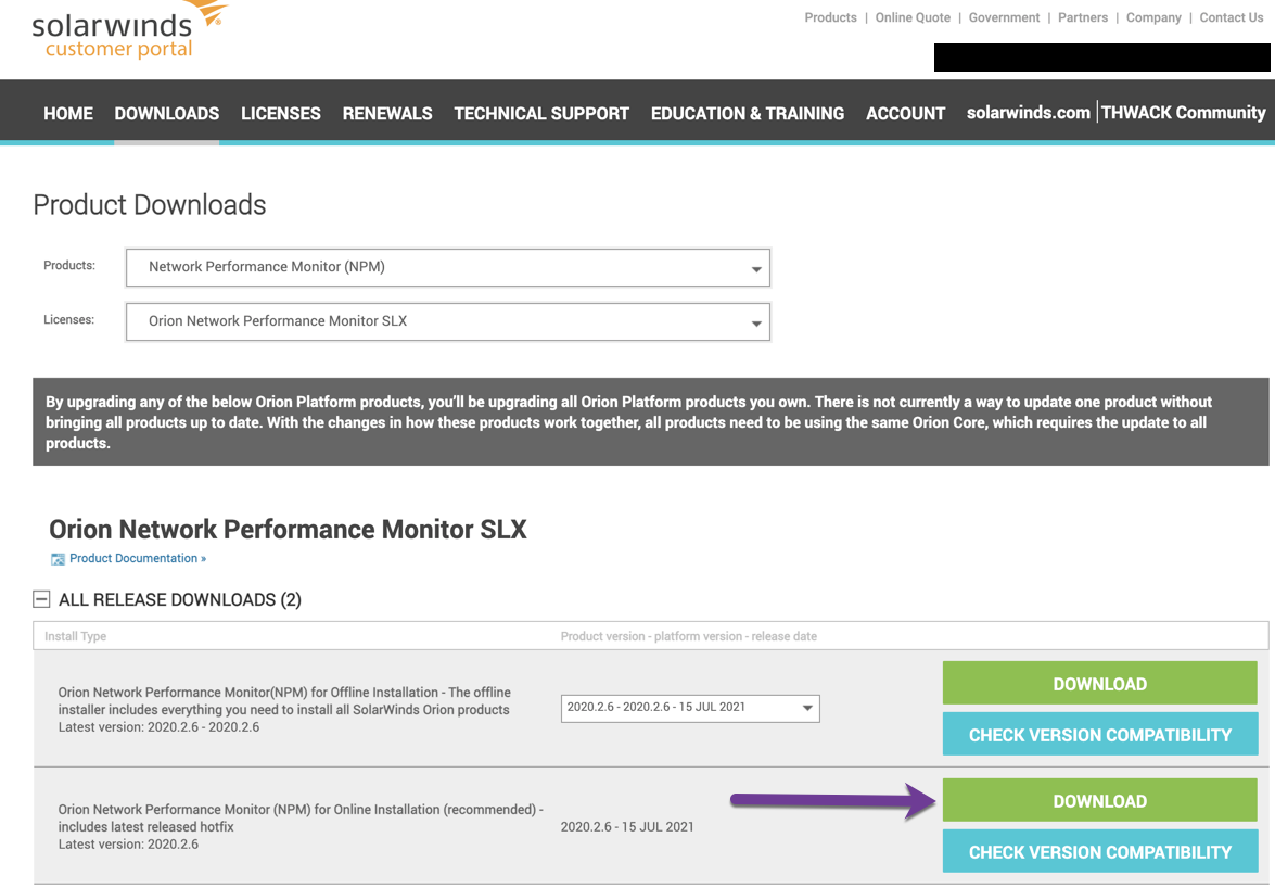While you are selecting a product to download, all Orion product installers are identical and contain all the necessary bits required to upgrade any/all modules that are installed on the server.
