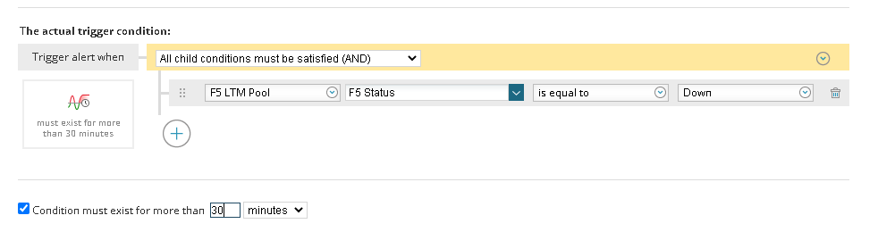 We have it set to 30m as we are primarily a network team and we only monitor/alert on network kit. The theory here is that the pool or pool member is a server in its own right and thus any primary alerts should be to the team responsible for that. This is very much a backup for our benefit for when the client inevitably says "the network is down" when in reality it's one server in a pool.I say this is our basic alert as we also have other triggers based on custom properties which check the node (the F5 in this case) is in BAU and is it a specific (aka overly paranoid) client.BTW: The "F5 LTM Pool" could be changed to Server or PoolMember.