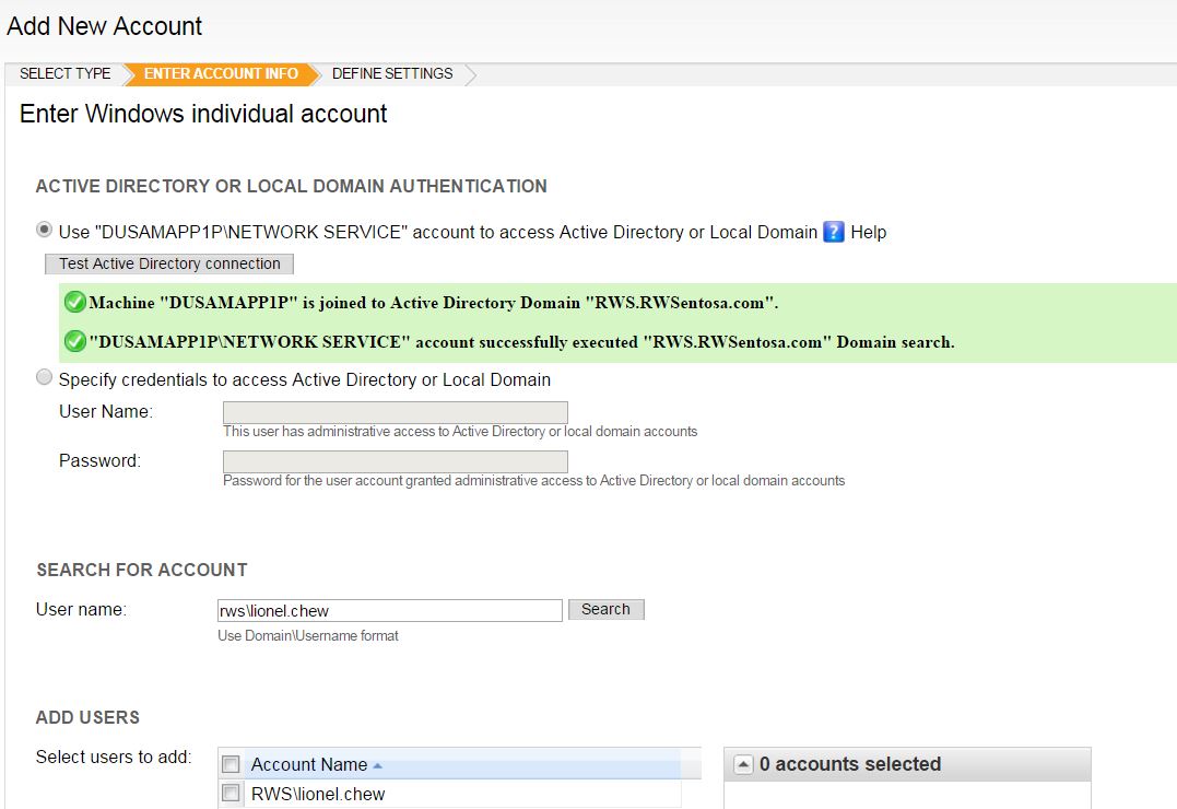 I am logged into the the web console through my elevated account. When I go in and try and add a new user I constantly get Zero results when searching AD. Even for my very own account. I have tried 'Domain\UserName' and 'Domain\*'