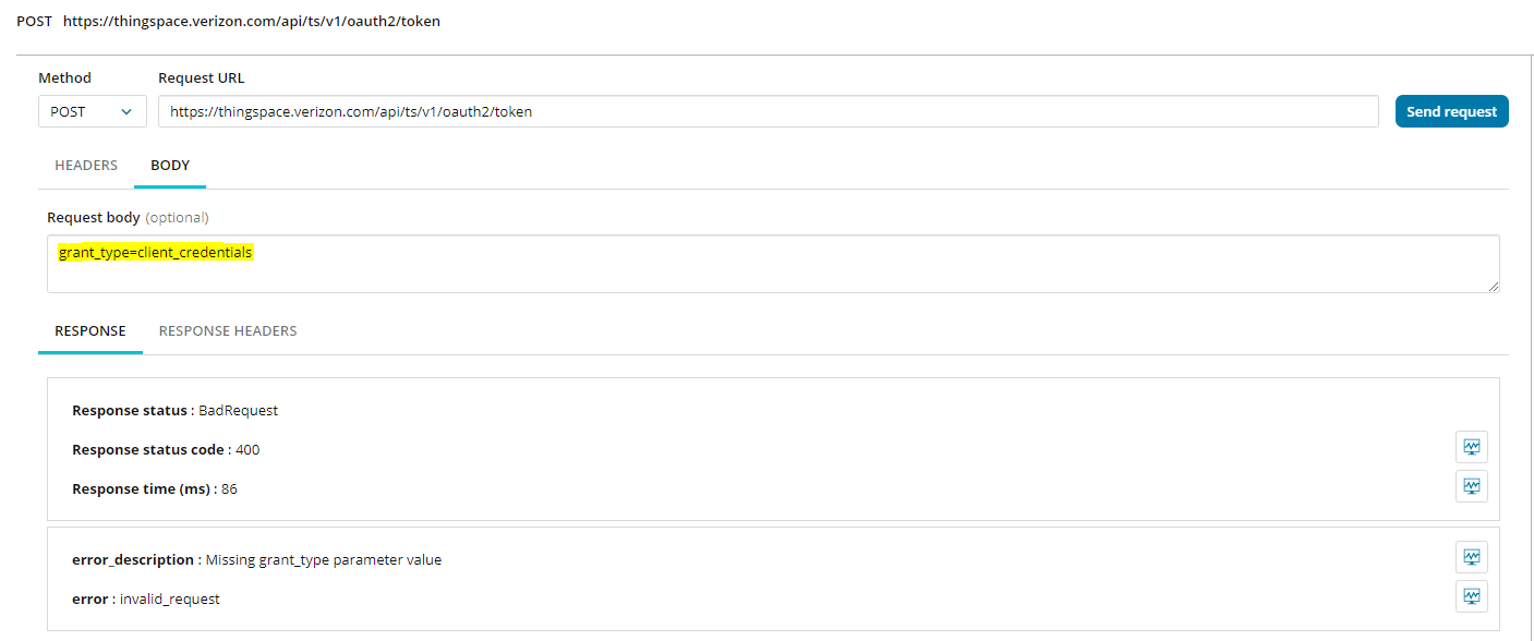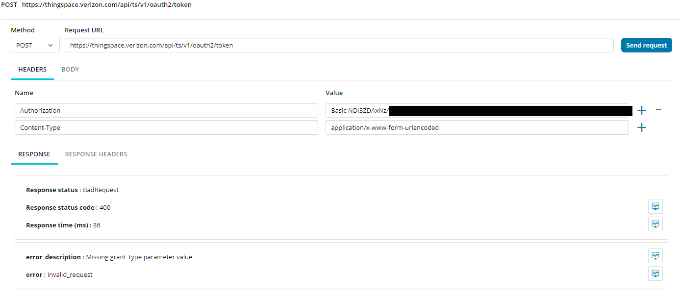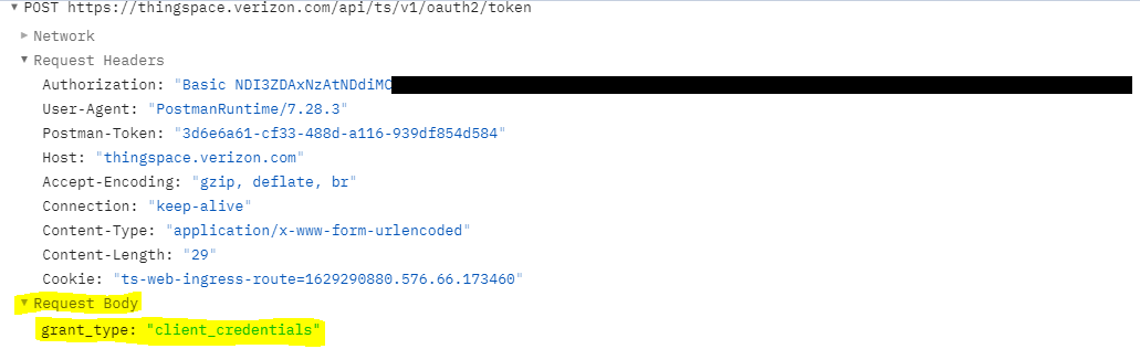 - Send a POST request to thingspace.verizon.com/api/ts/v1/oauth2/token with the encoded string in the header.