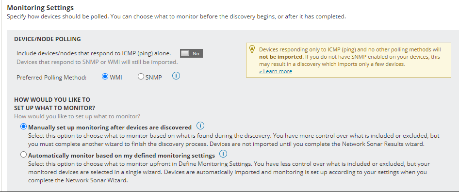 Note, there is a time out setting for each discovery, so it is recommended not to scan a large number (500+) of devices in one scan or change the time out (unless experience network latency) or hops.