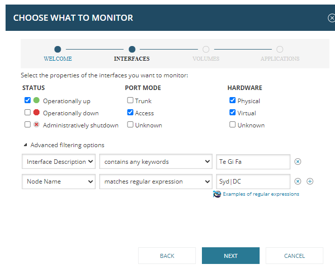 Note: Advanced filtering options are using 'AND' logic. For the same type of filter, leave a 'SPACE' between different values or use regex. The provided example will only add new discovered interfaces which have description contains 'Te or Gi or Fa'