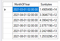 SELECT DATETRUNC('month', DATETIME) AS MonthOfYear, SUM(TotalBytes) AS Sumbytes