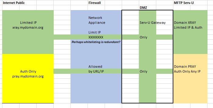 Our current setup is Serv-U and whitelisted IP to domain XRAY