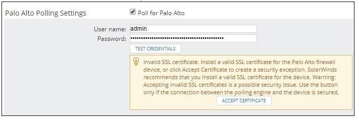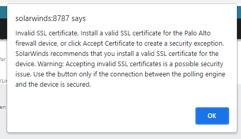 I'm trying to add Palo Alto monitoring and get a SSL certificate warning ( probably as it's a wildcard but that's for another time ) and get prompted to click "Accept Certificate" but the button does not appear? It looks as below: