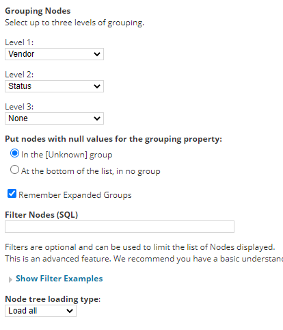 Adding multiple 'Nodes' widgets into the same page and using 'Filter Nodes (SQL)' to show different type of nodes are also commonly used. e.g. one widget would be used to show Down nodes only (status=2), another to show devices in branch A (assign custom property 'Branch' to nodes and filter by Branch = 'A'), or combine multiple conditions together status<>1 and branch='B'