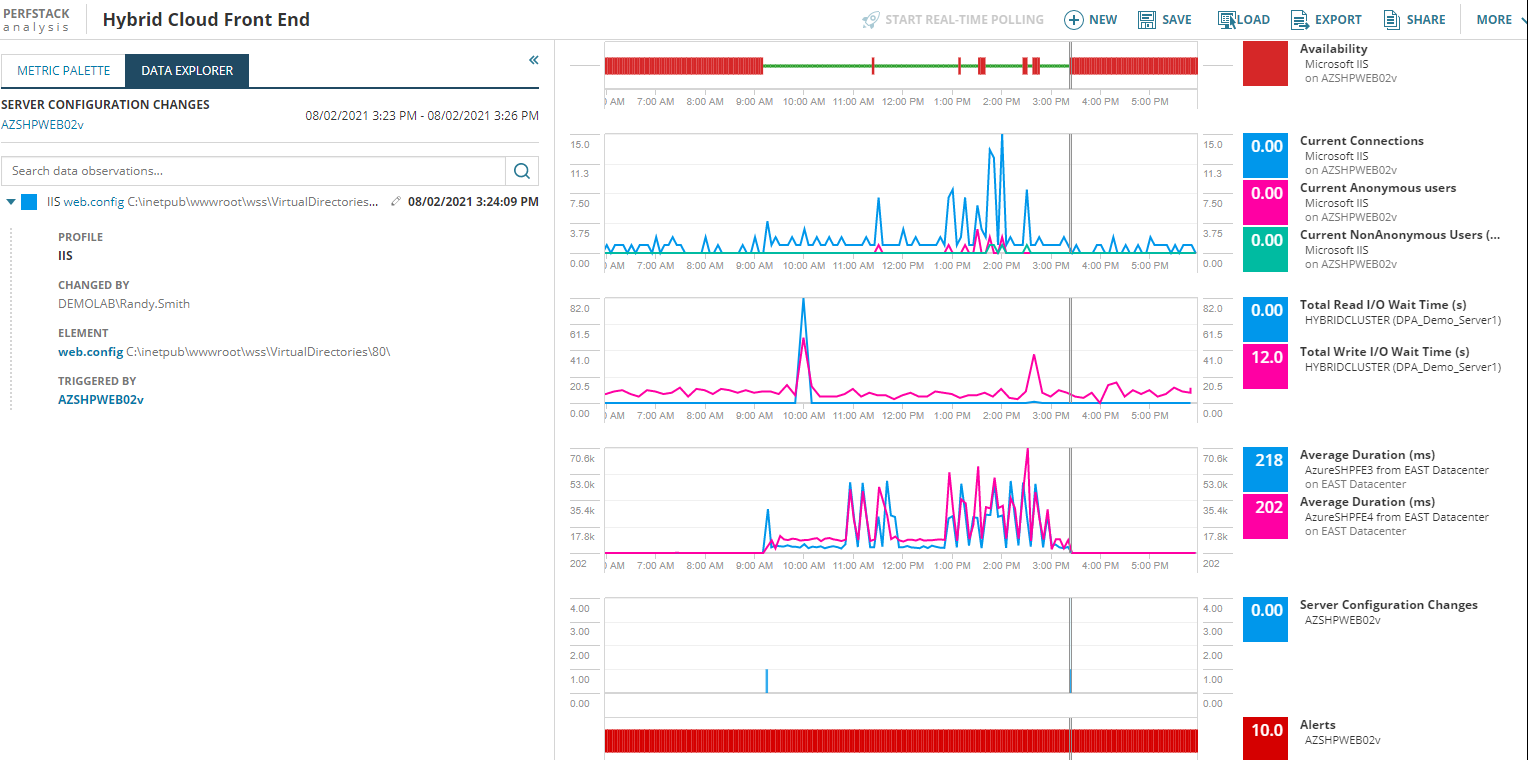 Some critical metrics and its direct dependencies will be added automatically. Hove over the mouse at spikes/event time to view data. Additional metrics can also be added (drag and drop) to support the analysis.