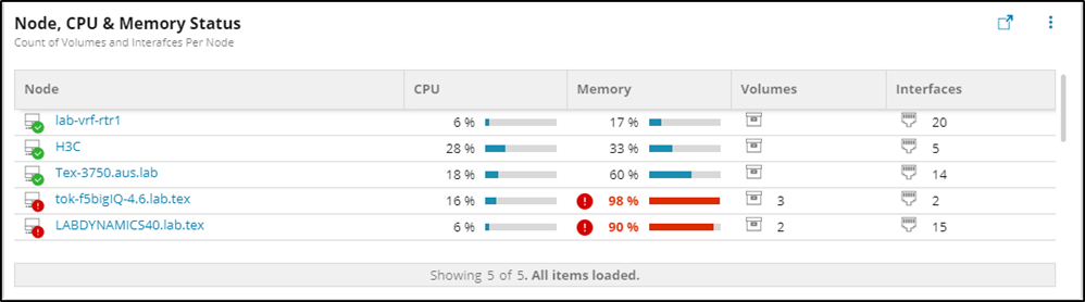 The CPU and Memory Columns use a 'Threshold Value' for the format. There are many threshold formats available based on Orion thresholds for the metric such as response time, packet loss, IOPS, Interface Utilization and many more. The Interface and Volume Count Fields both use a Simple Number Formatter.