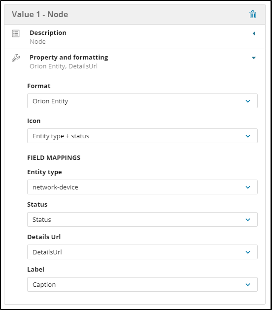 Define the description for the field such as 'Node' and expand the Property and formatting panel. Here you can choose from a section of preconfigured formatters. For the node column, use Orion Entity. This presents additional field mappings. Status, DetailsUrl and Label all match back to columns selected in the query builder. The Entity type is the icon of your choice from the supplied list.