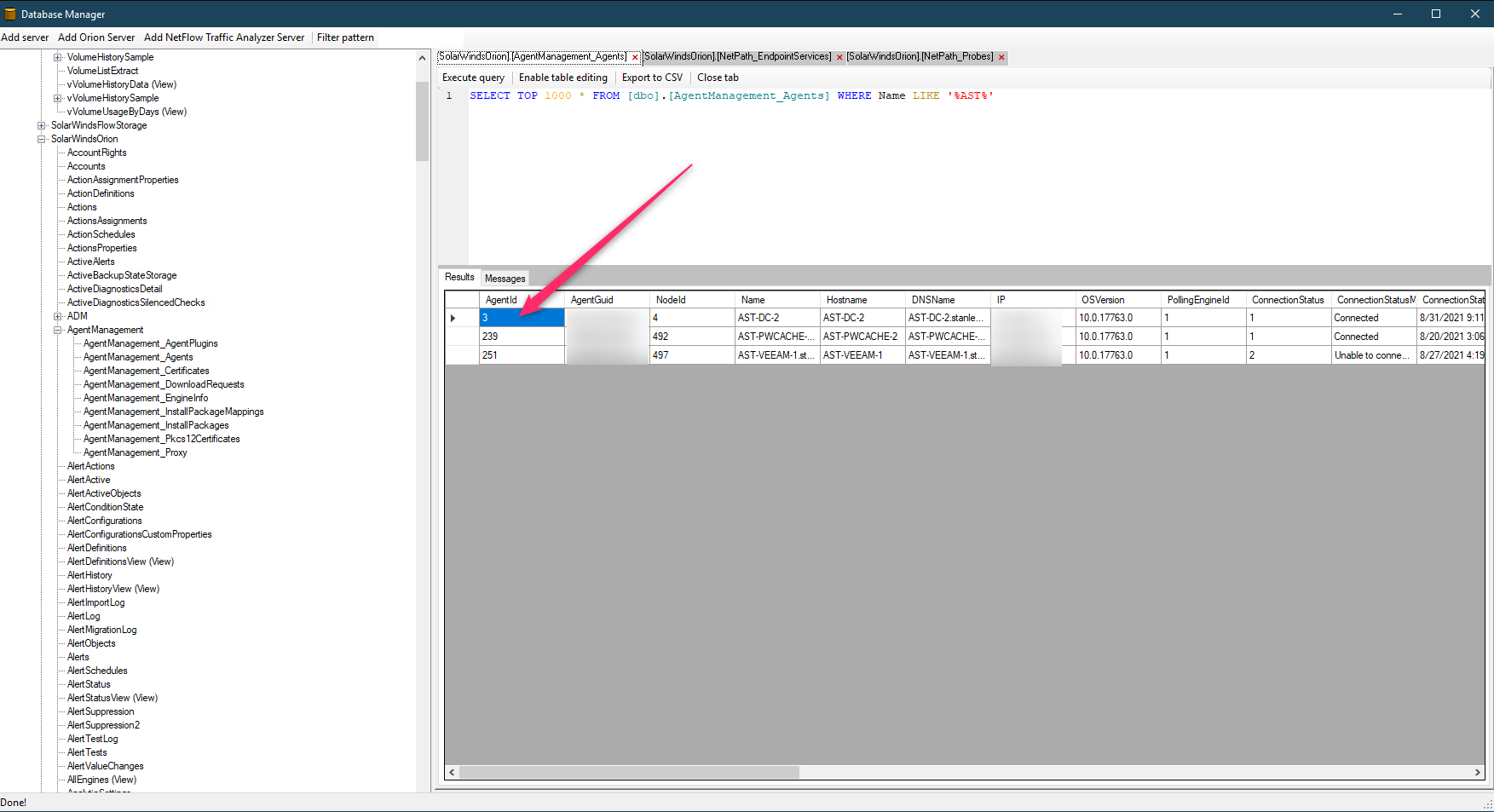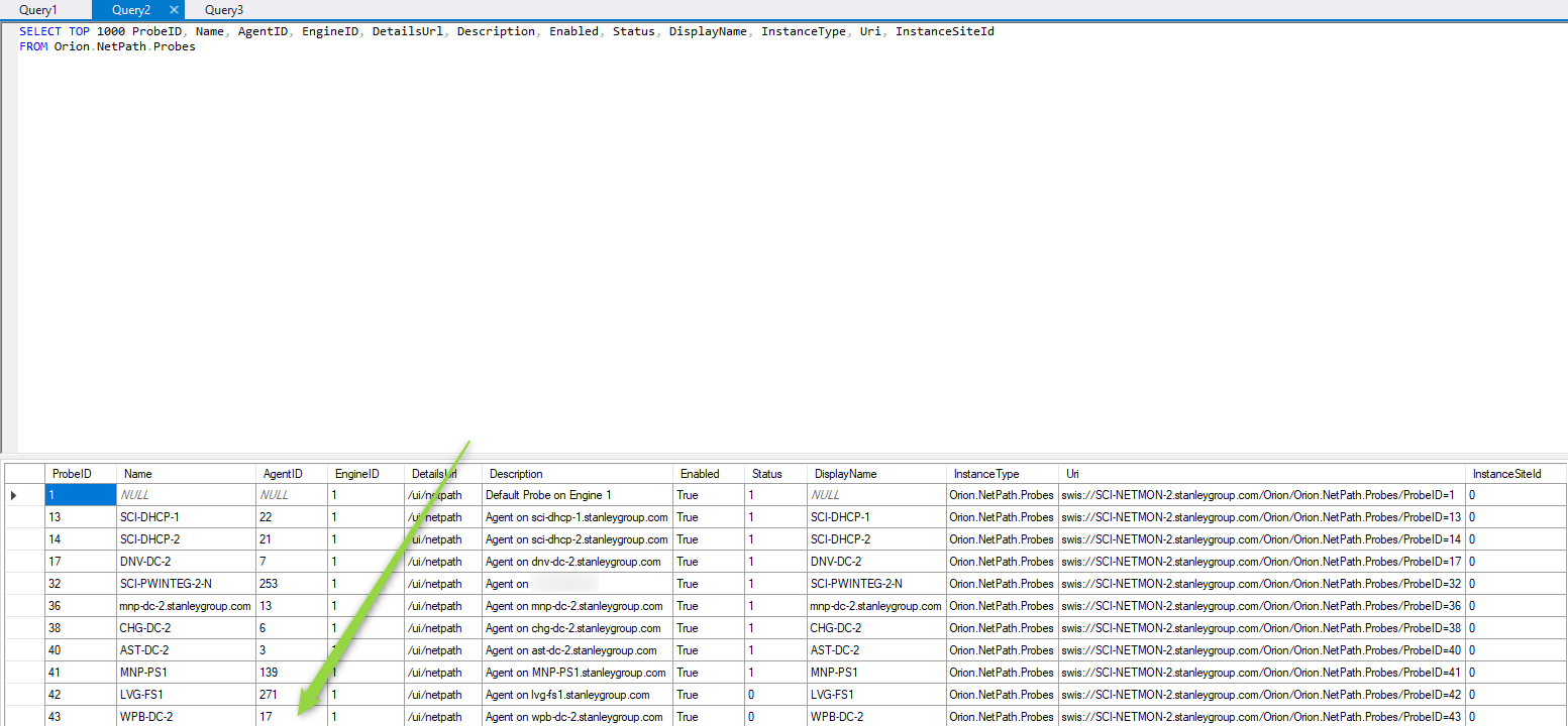 NETPath_Probes table query show that the AGENTID matches that from of the AgentManagement.Agents table entry.
