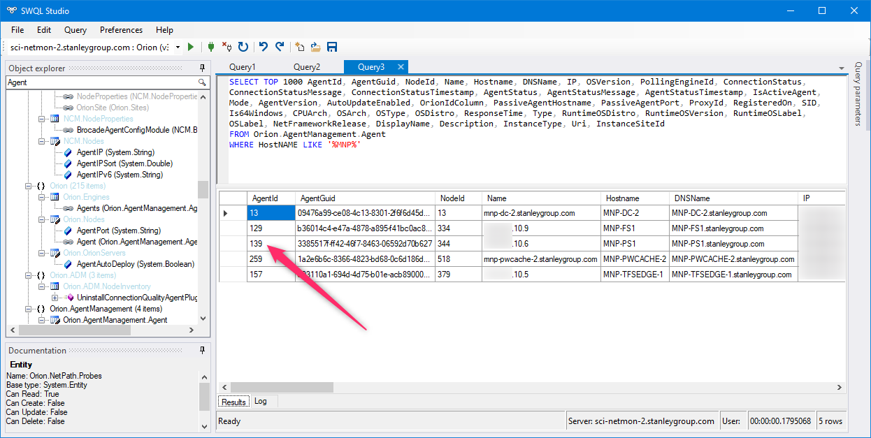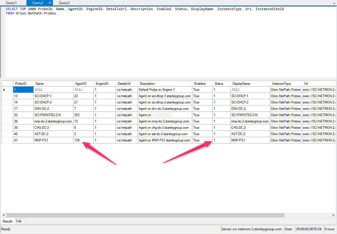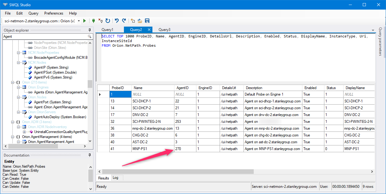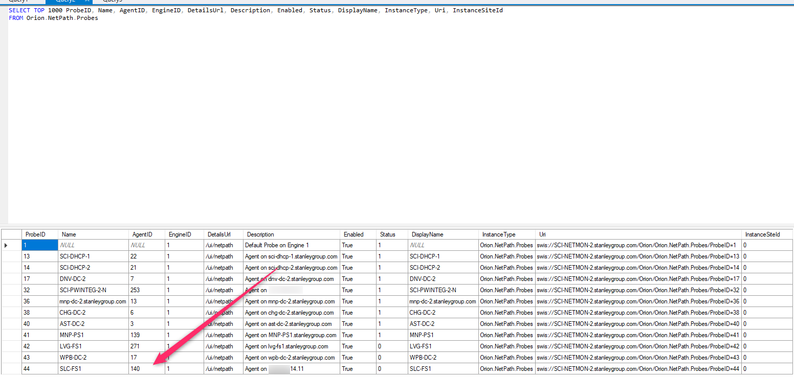 So I am guessing at this point there is something wrong with the search creating the cross reference between the PROBEs table [SWQL Orion.NetPath.Probes] and the AGENTs table [SWQL Orion.AgentManagement.Agent].