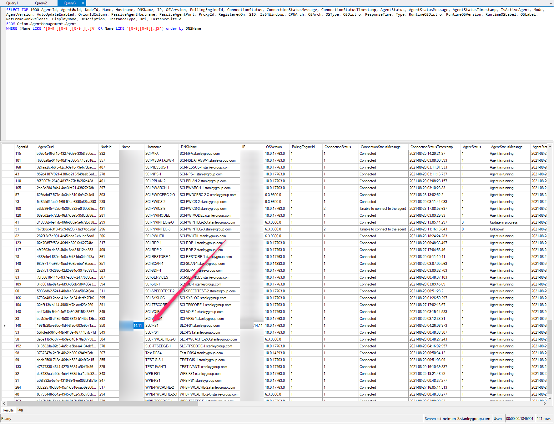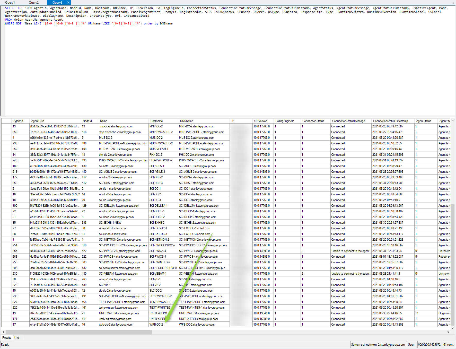 Query from the AgentManagement.Agents table where Agent Name is like an IP address.