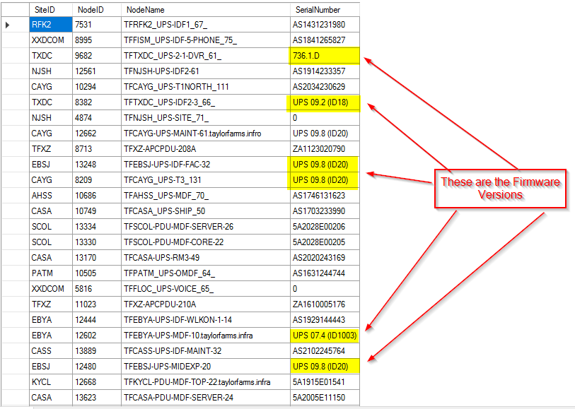 I've started to obtain the APC UPS/PDU Serial Numbers and Firmware, but the results are being returned in the Serial Number column. I need to segregate the values, since the recipients won't understand the report. Here's my beginning query: