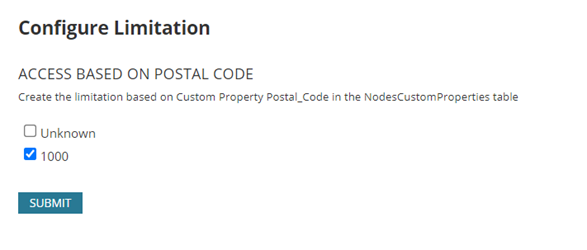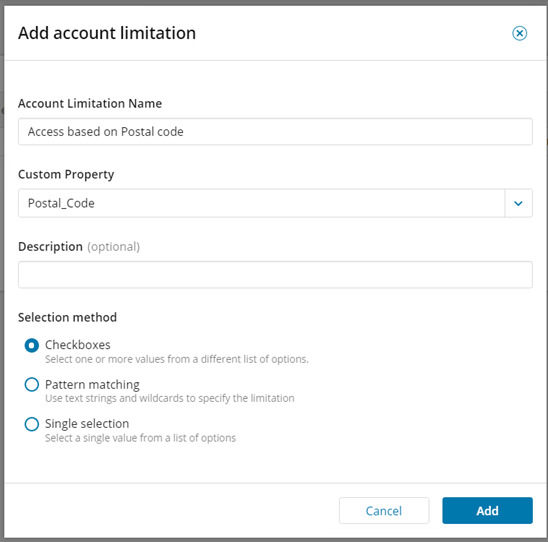 3- Open the Manage account limitation, Select the custom Property ( Postal_Code) and Create the account limitation category called “Postal_Code.”