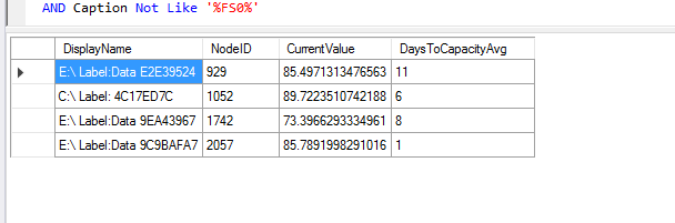 SELECT [VForcast].Volume.Node.Caption AS [Node Caption] , [VForcast].DisplayName , [VForcast].CurrentValue , [VForcast].Volume.Size , [VForcast].DaysToWarningAvg , [VForcast].DaysToCriticalAvg , [VForcast].DaysToCapacityAvg , [VForcast].Volume.TypeFROM Orion.VolumesForecastCapacity AS [VForcast]WHERE [VForcast].DaysToCapacityAvg <= 100000 AND [VForcast].Volume.Type IN ( 'Fixed Disk' , 'FixedDisk' , 'Mount Point' , 'Network Disk' )ORDER BY [VForcast].DaysToCapacityAvg</pre>Obviously change out the DaysToCapacityAvg number in the WHERE clause to something more reasonable. I used 100000 to guarantee results in my environment.