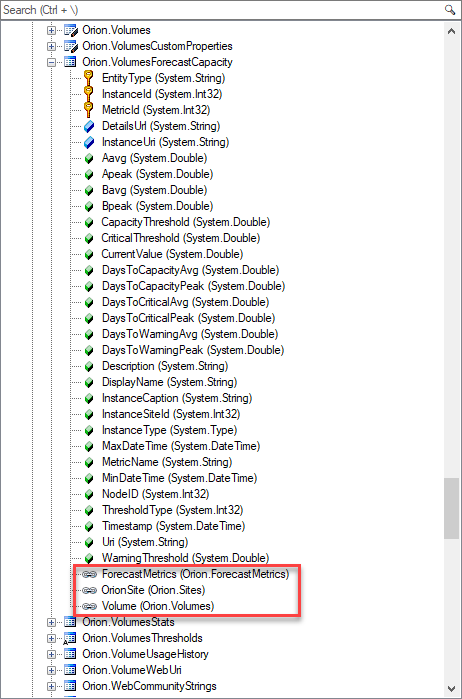 Orion.VolumesForecastCapacity connects to Orion.Volumes, which connects to Orion.Nodes.