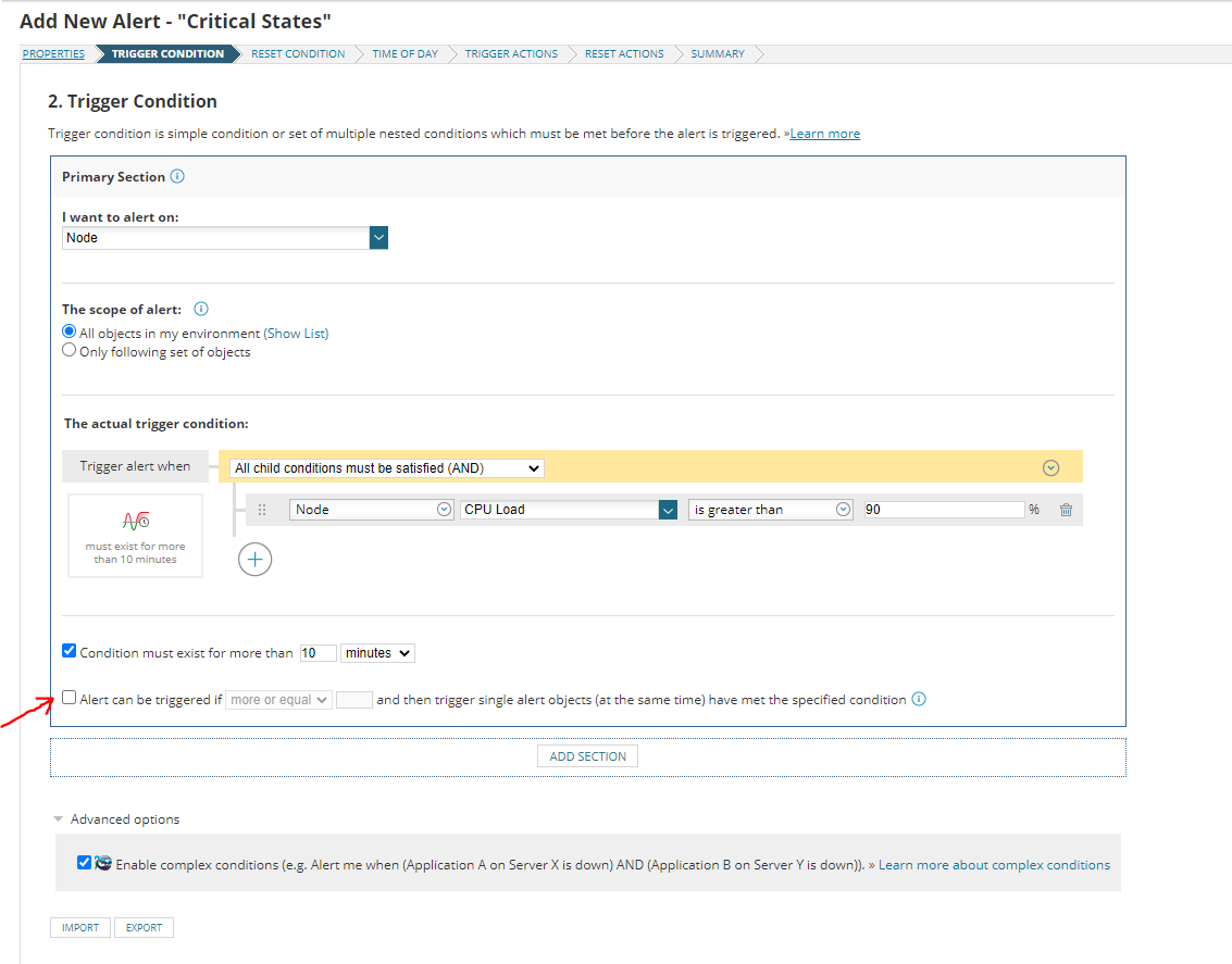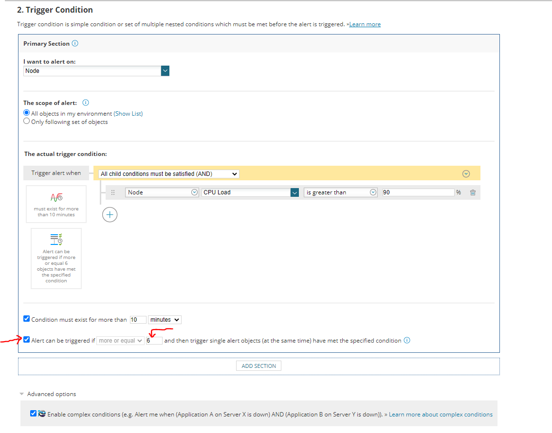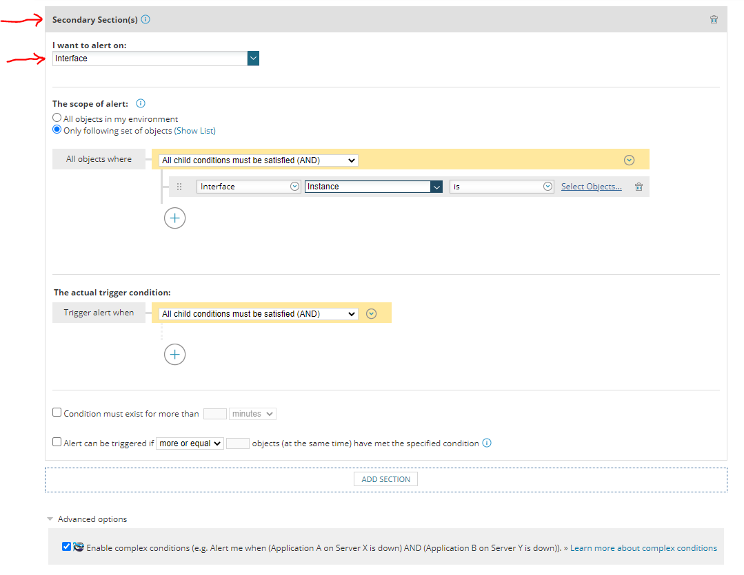 09.) In the above screenshot, you can see ADD SECTION button. If you want, you can add a new section to your alert which has a completely new set of Alert Logic Conditions.
