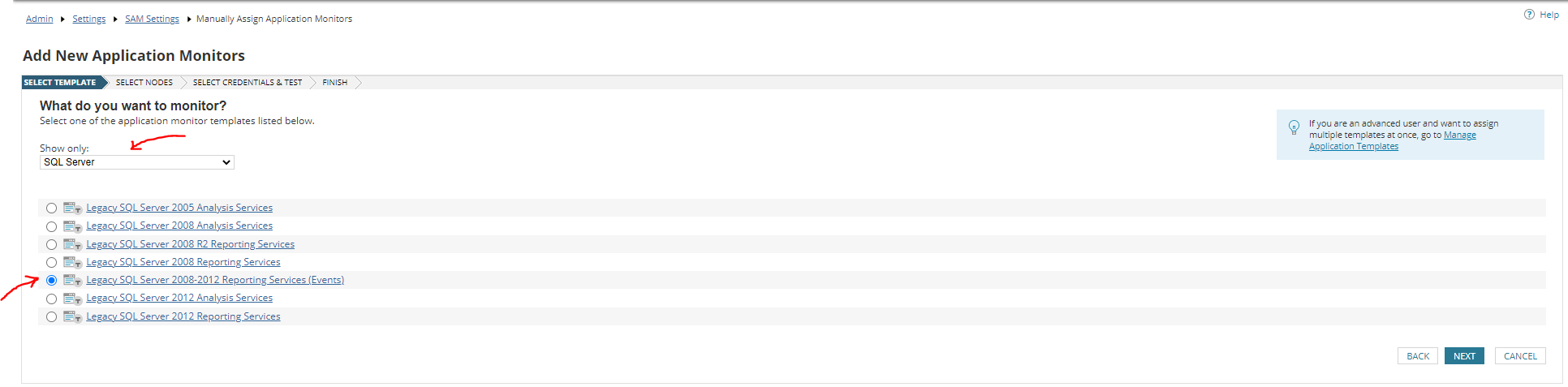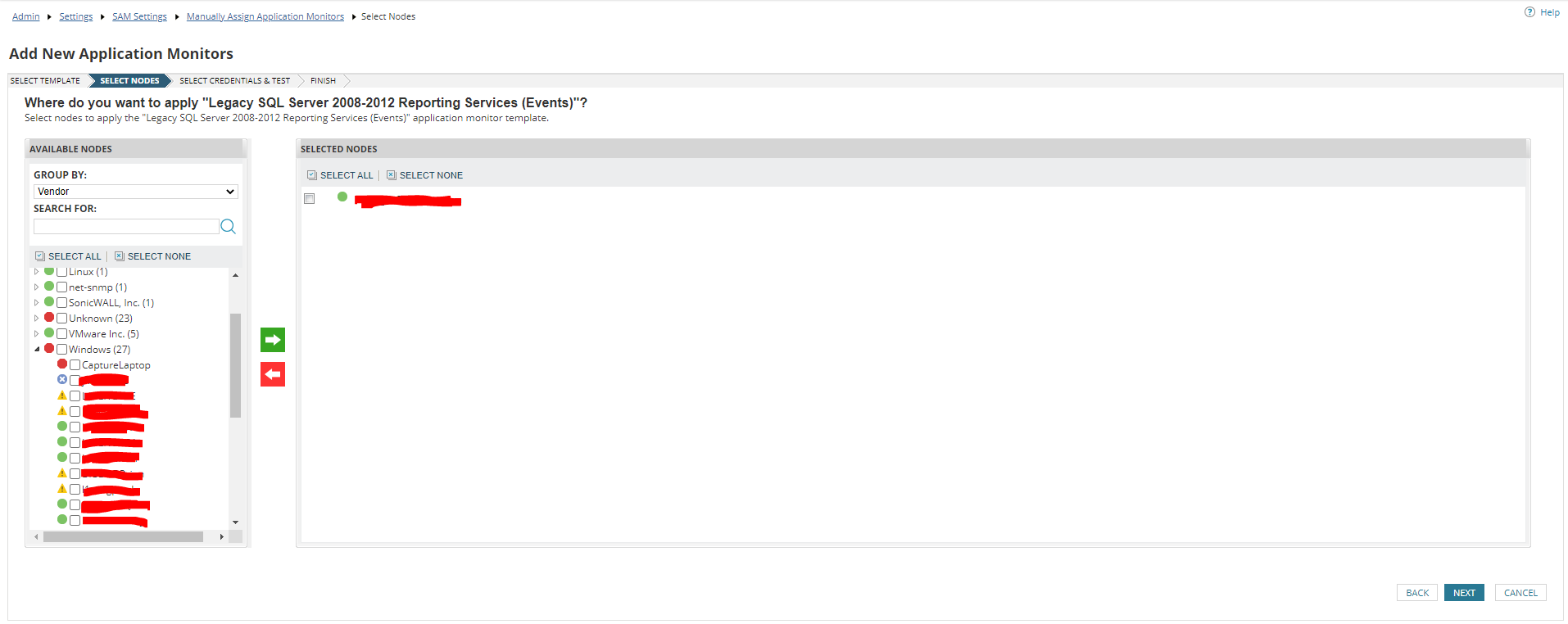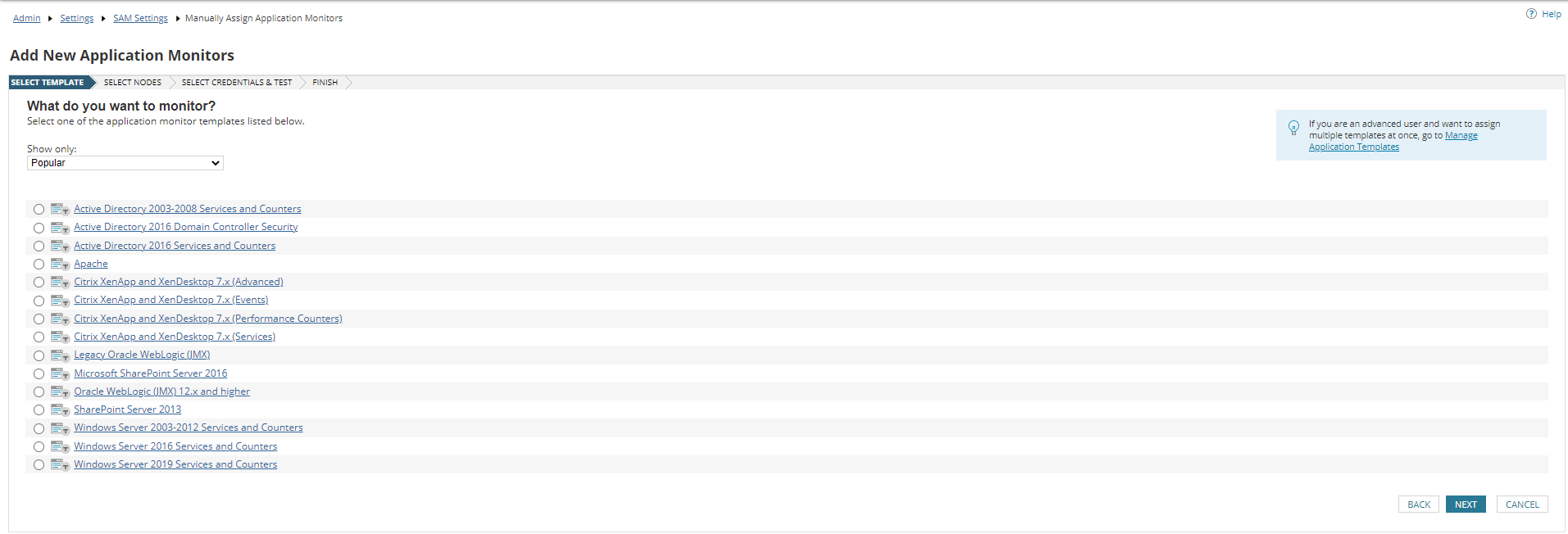 01.) Navigate to Settings > All Settings > SAM Settings and click on Manually Assign Application Monitors and you will see the below menu.