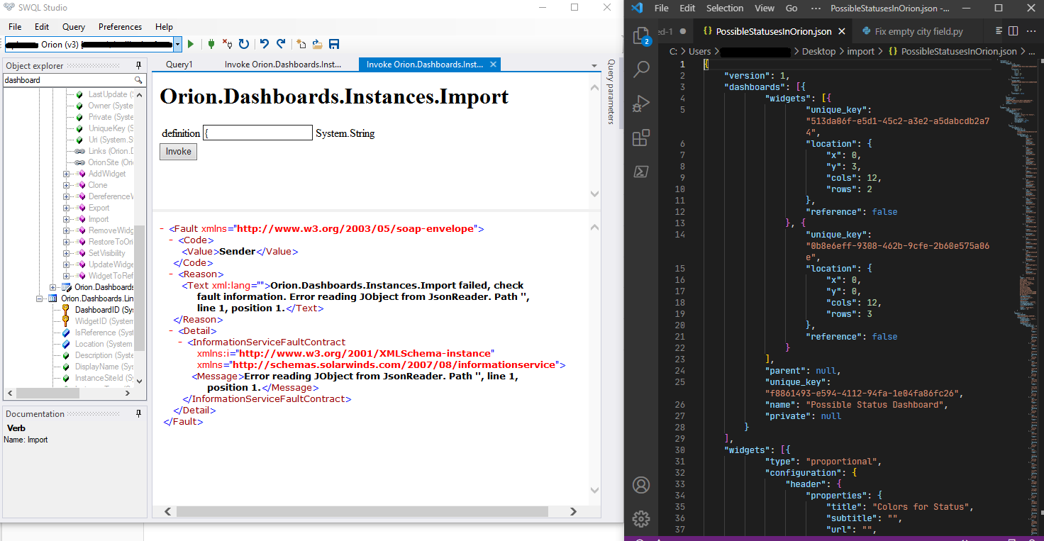 - Importing the Modern Dashboard JSON using the SWQL Studio method (as described in the support documentation) requires the JSON to be 'linearized' (all the content on one line). This can be done in a number of ways, but most people use a plain text editor which has this as a native feature or via a plugin.
