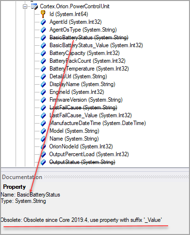 In SWQL Studio Cortex.Orion.PowerControlUnit shows the string elements PowerControlUnit BasicBatteryStatus, LastFailCause, OutputStatus, and ReplaceIndicator have all been deprecated and replaced with integer fields with similar field names with a _Value suffix. So I'm assuming that if I create a report for PowerControlUnits I shouldn't be using the deprecated fields. In my report I would most certainly want to include the string value, not an integer. However I can't find a lookup or crosswalk table to match up integer values with their corresponding string representation. Does such a table exist?