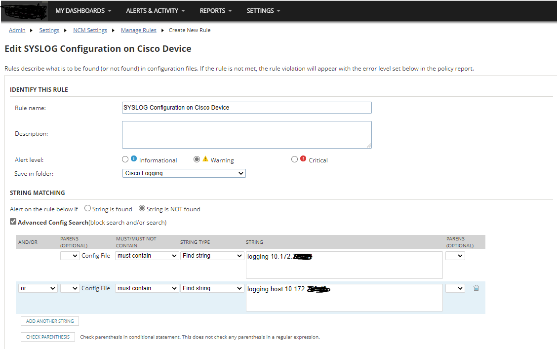 The aim of the rule is to check whether proper SYSLOG server is configured on all Cisco devices. Due to different syntax there are two conditions, namely: "logging 10.172.x.x" and "logging host 10.172.x.x" When I go to Policy Report, I can see that in most cases there's a policy violation although SYSSLOG server is present in a configuration. Can anyone tell me what is the reason for that? Thank you in advance!