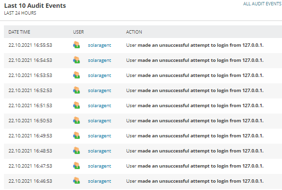 I get message from Audit Events: User made an unsuccessful attempt to login from 127.0.0.1. caused by solaragent every 1 minute from time I installed platform 2020.2.5.