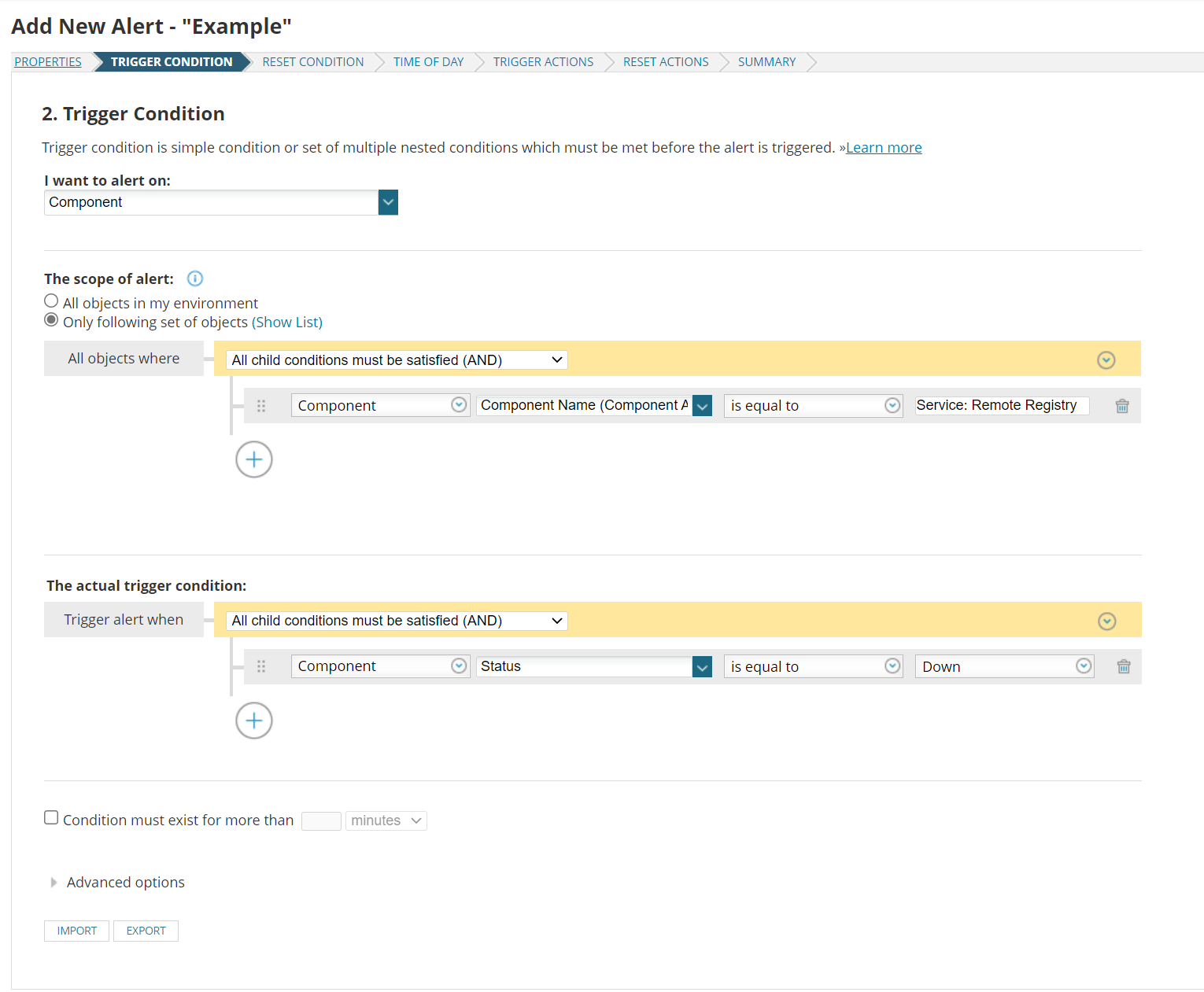 I need to know which trigger condition fields to use in my alert that will allow me to trigger on a specific component in my SAM template. The assigned template has many components. I see how to monitor the application and if it goes unhealthy, but I'm unclear on how to create an alert on just a specific component.
