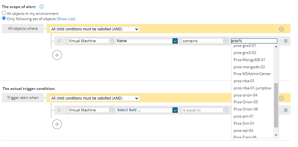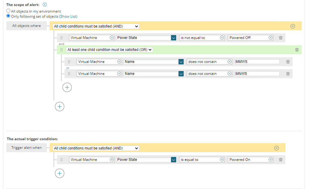 I have an alert set to send an email when a VM storage utilization is at 99%. I want to exclude some VMs from this alert but can't seem to figure it out. I want to exclude VMs that start with MMWS and MNWS. I tried using the "does not start with" and "does not contain" but I still get alerts for VMs that start with MMWS and MNWS.