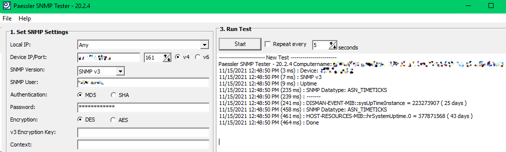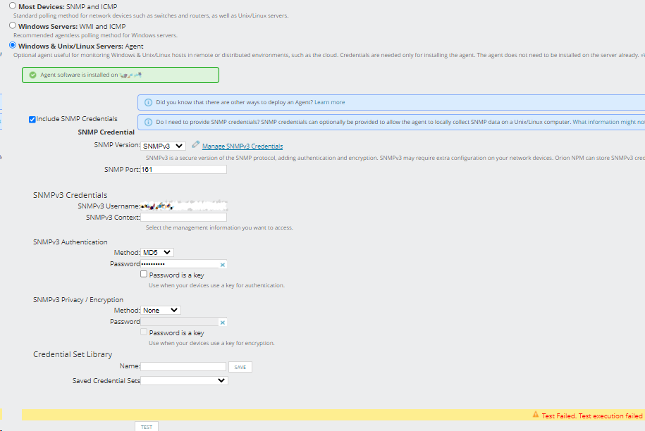 Getting “Test Failed. Test execution failed” error after pressing “Test” button with valid SNMP credentials: