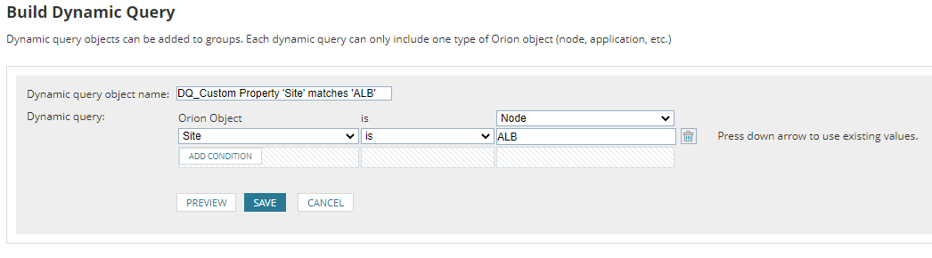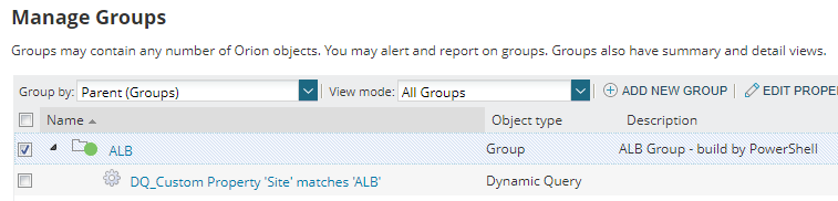 # Build a group with a dynamic query member# Variables# Group Name and Description$GroupName = 'ALB'$GroupDescription = 'ALB Group - build by PowerShell'# Dynamic Query Name and Description$QueryName = "DQ_Custom Property 'Site' matches 'ALB'"$QueryDefinition = "filter:/Orion.Nodes[CustomProperties.Site='ALB']"# Build the Definition for the Dynamic Query$MemberDefinitions = [xml]( @" $( $QueryName ) $( $QueryDefinition )"@ ) $( $Query1Name ) $( $Query1Definition ) $( $Query2Name ) $( $Query2Definition )"@ )#># Connect to SolarWinds Information Service$SwisConnection = Connect-Swis -Hostname "orion.demo.lab" -Username 'YourUsername' -Password 'YourPassword'# Call the verb# Arguments are as follows:# Name of the Group# "Owner" of the group - this is almost always be "Core"# Time to poll for status changes (in seconds)# Status calculation type: 0 = Mixed [default], 1 = show worst, 2 = show best# Description for the group# Polling enabled "true" / "false"# Member Definitions from above converted to a 'document' from raw XML# Make the call and store the response (it includes the group ID$BuildGroupResponse = Invoke-SwisVerb -SwisConnection $SwisConnection -Entity 'Orion.Container' -Verb 'CreateContainer' -Arguments @( $GroupName, "Core", 60, 0, $GroupDescription, "true", $MemberDefinitions.DocumentElement )# Output the group ID for funWrite-Host "We created a group with ID: $( $BuildGroupResponse.InnerText )"