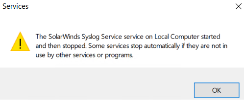 I have Solarwinds orion platform 2020.2.6 in my deployment and i am unable to start the Solarwinds Syslog and Trap Service. Windows is showing following message: