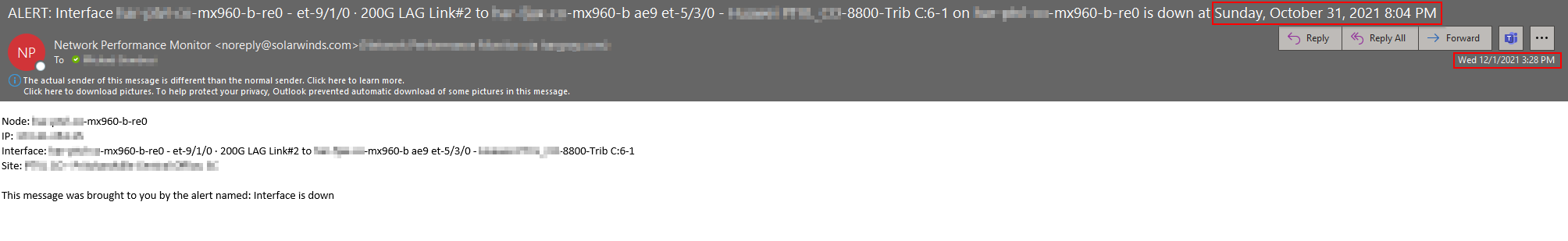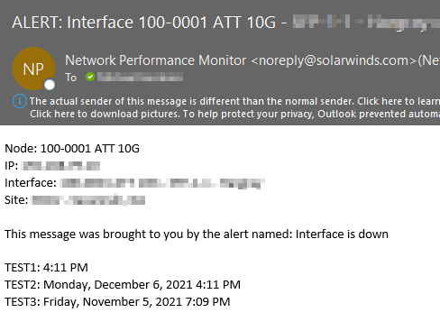 Live alerts for these devices show the correct date/time. A test I recently did: ran an executed test on an interface and received the test email with the date and time of October 21st, 2021. Purposely brought the interface down to trigger a real-world alert on Tuesday and received the email stating November 30th, 2021.