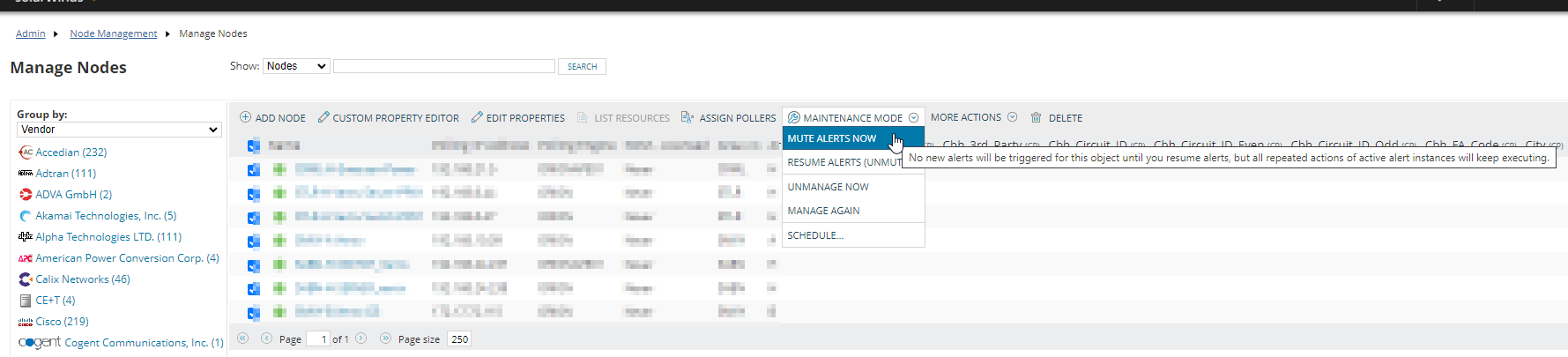 Is there an efficient way to mass mute interfaces? To give some background, our company will sometimes mass mute nodes by creating a spreadsheet with a list of all nodes that need to be muted and importing that list on the manage nodes page. It would help me make a common custom property for the list of nodes I could then select and schedule for maintenance mode.