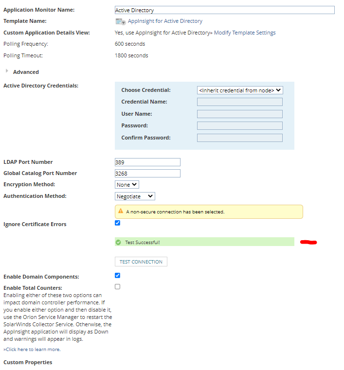 Hmmm, I wounder if the "test-button" tests all ports necessary... "Trust is good, control is better". I wound do a "Test-netconnection SERVERNAME -port 389" from powershell on your orion server to be sure.