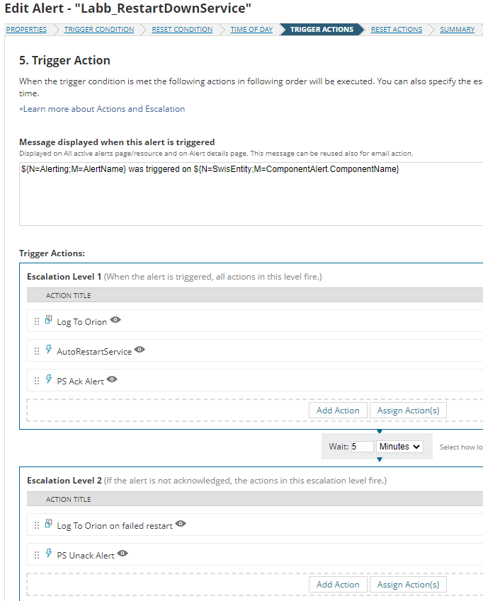 Second escalation level: IF service is still down after x mins, log the failure to orion and UnAcknowledge the alert.