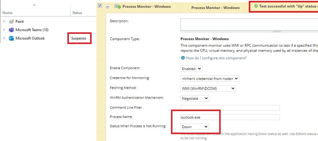 In this example i've suspend the process "outlook.exe", but at SAM test, show me the process is UP.