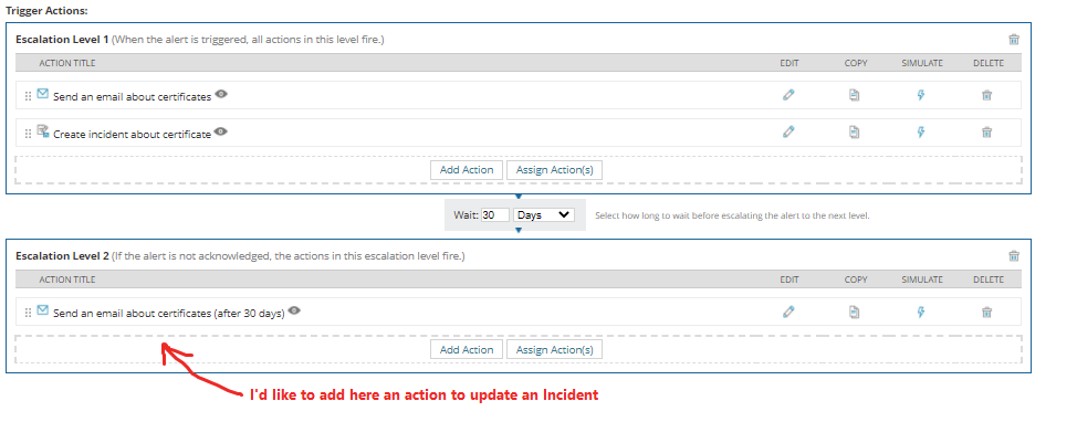At the second level (if nobody reacts for 30 days) I want to send another email alert and update existing SN incident with comment or working note.